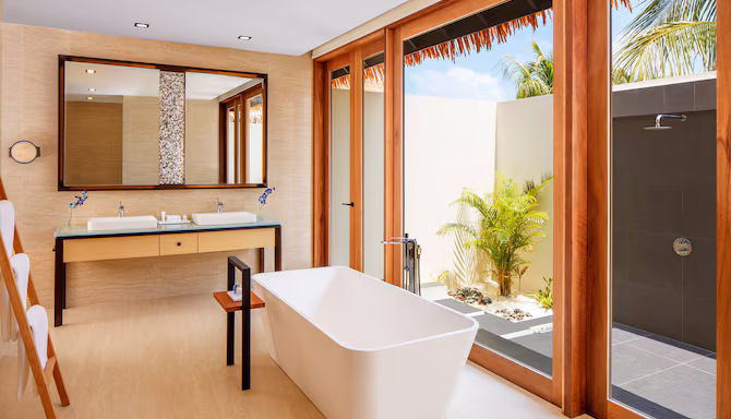 Guests can reach the resort via a 30-minute seaplane transfer from Velana International Airport (MLE) or by taking a 20-minute domestic flight to Maamigili Airport (VAM), followed by a 15-minute speedboat ride. Seaplane transfers operate during daylight hours, accommodating international flights arriving between 6 am and 3:30 pm and departing between 9 am and 8 pm. Baggage allowances and excess baggage fees apply.