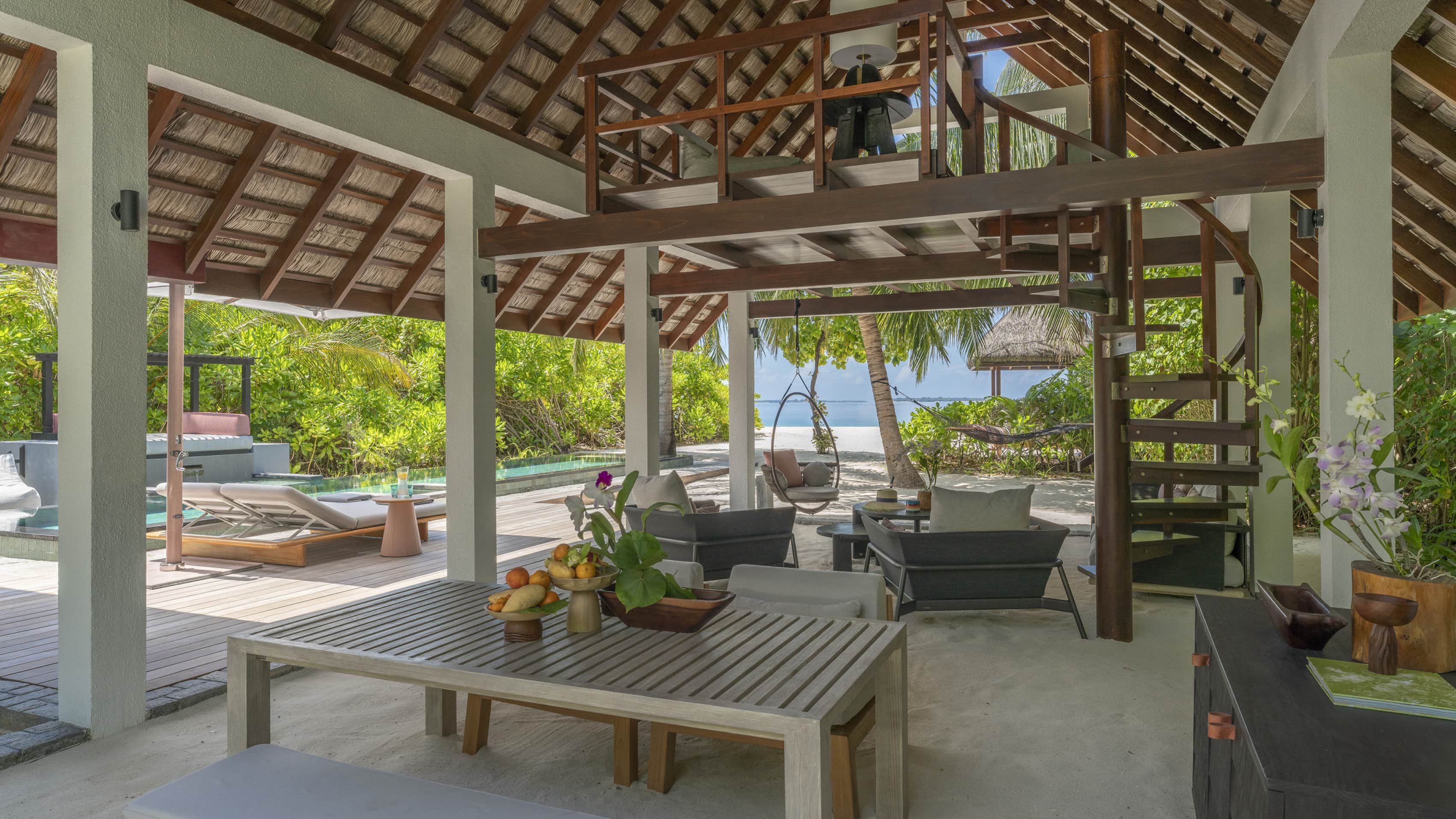 A secluded overwater retreat featuring a 12-meter lap pool, daybed, swing couch, overwater nets, and a sea-gazing loft with elevated lagoon views. Designed for privacy and relaxation with screened outdoor areas and partial ocean views.