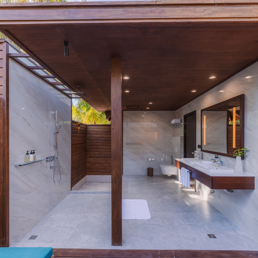 Perched above the lagoon with direct access to the house reef, this villa features a king-sized bed, a partially open-air bathroom with rain shower and open-air Jacuzzi, a private deck with sunrise views, and luxurious amenities including a 55-inch TV, minibar, and complimentary Wi-Fi.