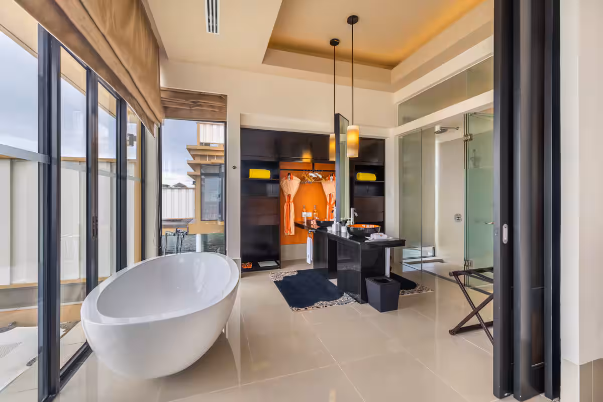 An intimate and luxurious villa featuring a private infinity pool, outdoor sunbeds, an outdoor bathtub for two, al fresco bathroom with indoor and outdoor rain showers, and a private garden area. Perfect for couples seeking a serene oceanfront escape with modern amenities.