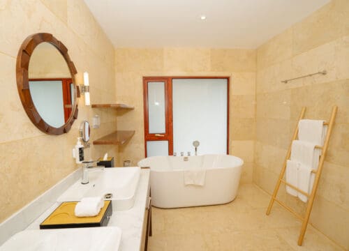 A spacious villa opening directly onto the soft white sandy beach, offering a protected area for sunbathing, snorkeling, and swimming, making it the perfect island getaway.