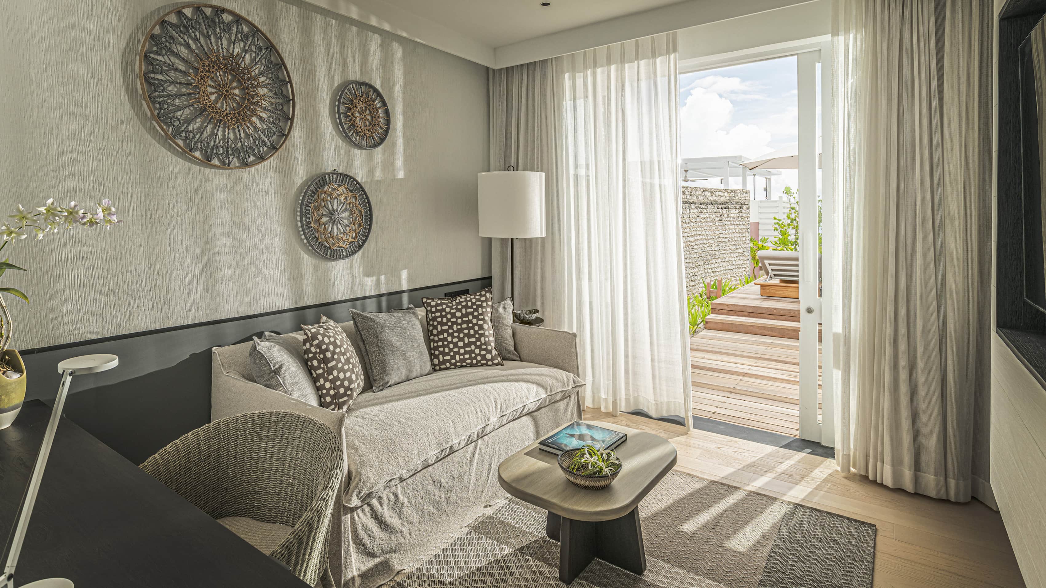 Luxurious overwater suite featuring three bedrooms with en-suite bathrooms, a private 20-meter infinity pool, stunning sunset ocean views, direct lagoon access, spacious living and dining areas, a fully equipped kitchenette, private study, glass floor panel, overwater hammock, and private gym. Accessible only by boat for exclusive privacy.