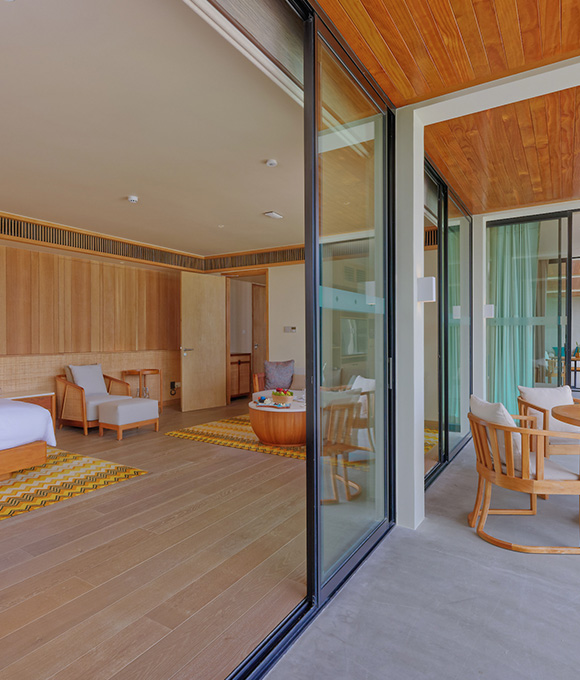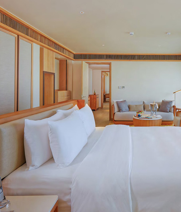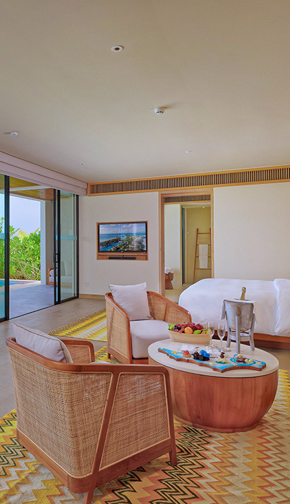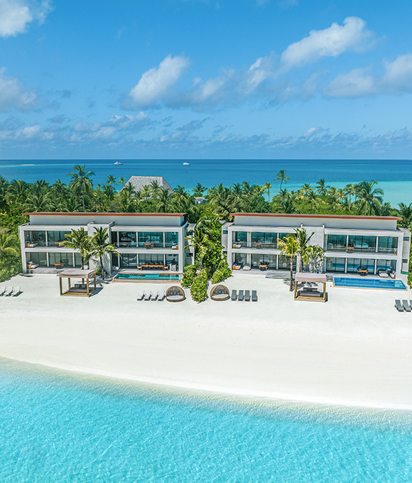 An expansive and luxurious three-bedroom beachfront residence featuring spacious living areas, a private pool overlooking the lagoon, panoramic ocean views, and exclusive amenities including a private terrace, dedicated workspace, wine cellar, and butler service.