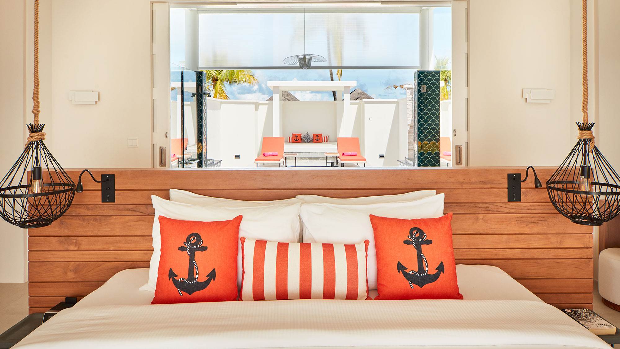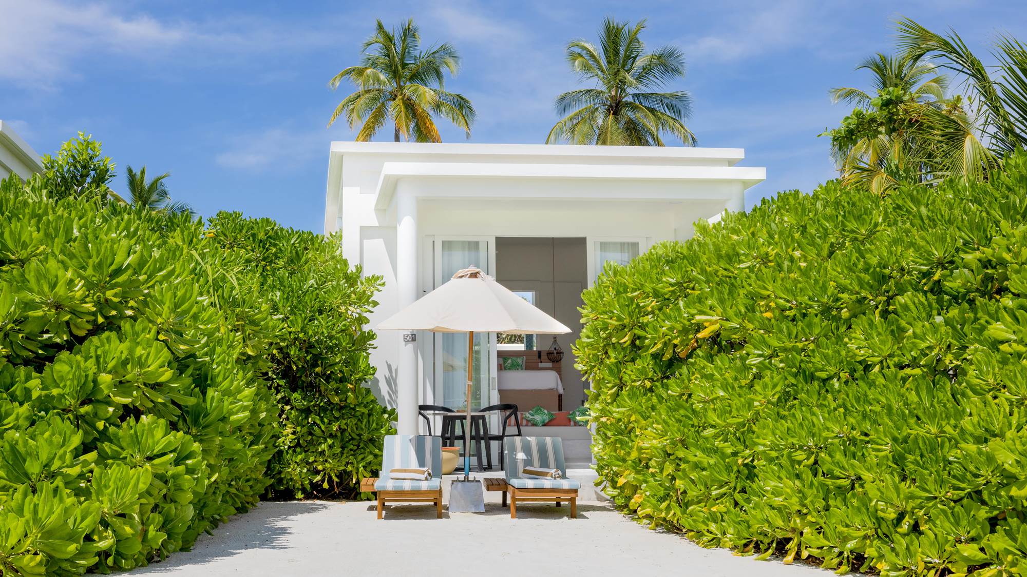 An expansive and luxurious beachfront retreat featuring two master bedrooms with king-size beds, a flexible living area, and the largest private pool on the island. Enjoy spectacular sunrise views over the beach and ample outdoor space with daybeds, loungers, and a dining area.