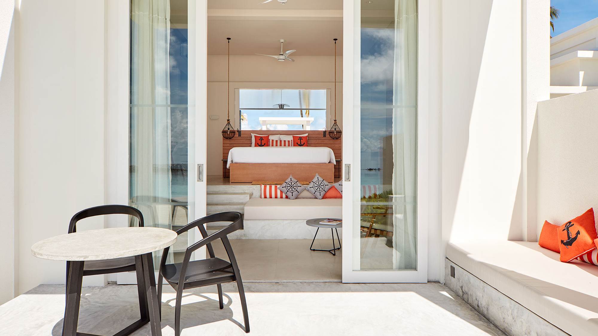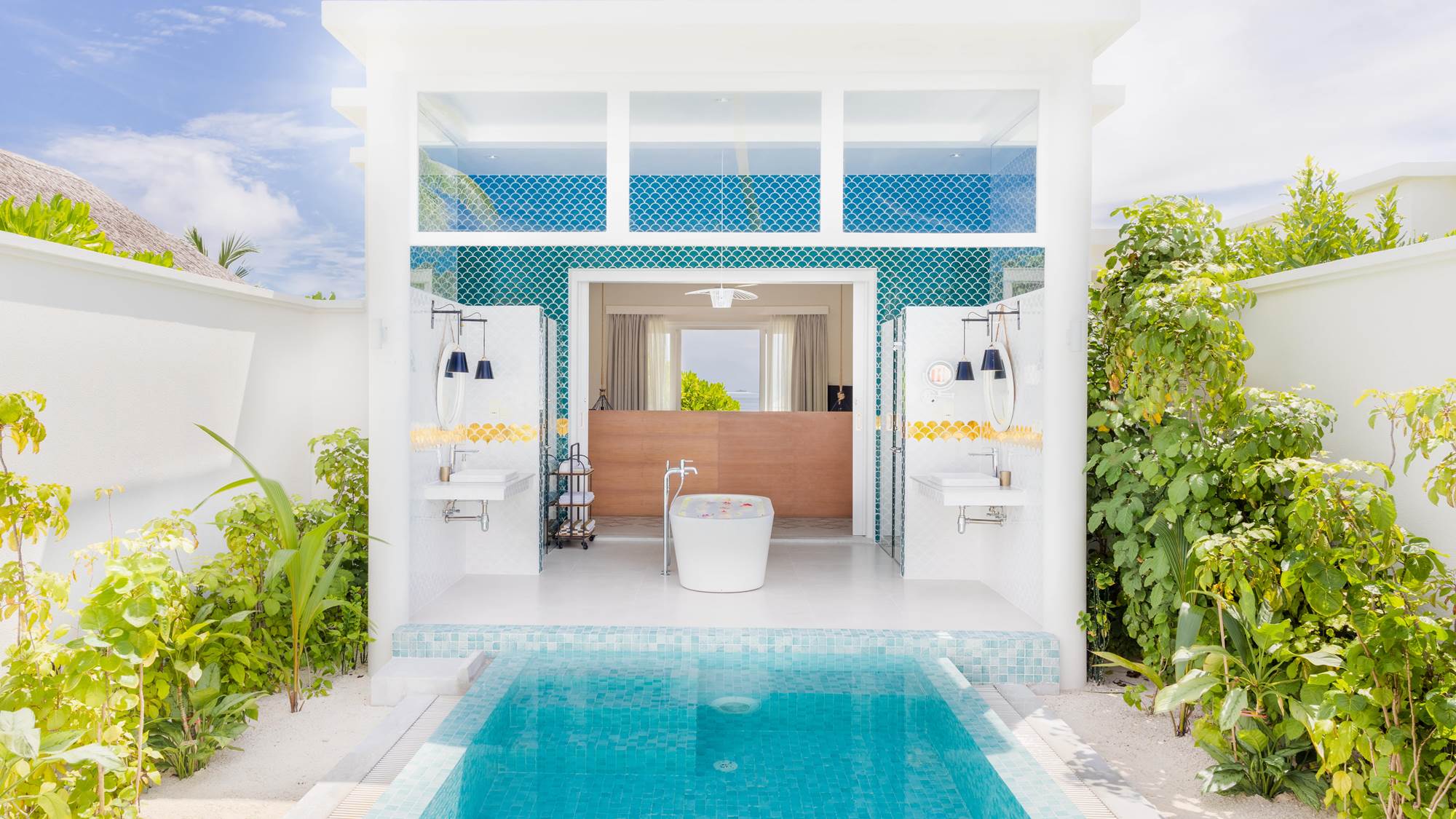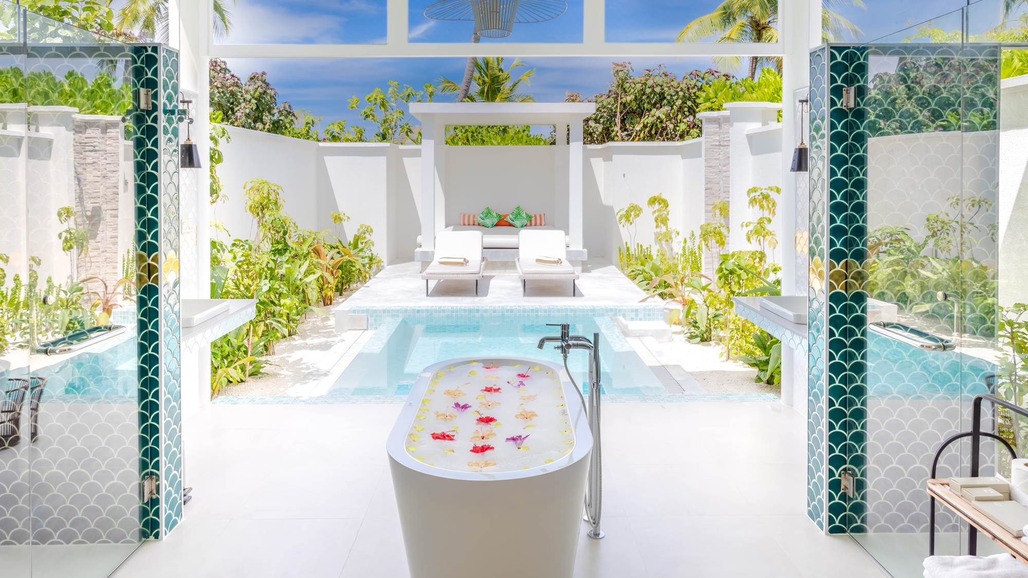 A contemporary overwater villa flooded with natural light, featuring a king-size bedroom, spacious bathroom with a freestanding tub and separate walk-in rain shower, and a fully furnished outdoor deck with a private plunge pool and direct lagoon access.