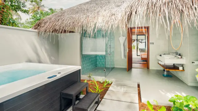 The Sunset Beach Villa offers a serene retreat on the island's western shoreline with stunning beach and lagoon views. Features include a king-size bed, private outdoor living area with daybed, open-air bathroom with indoor and outdoor showers, direct beach access, beach sun loungers, complimentary high-speed Wi-Fi, Apple TV, minibar, air conditioning, ceiling fan, and access to a 24-hour fitness centre.