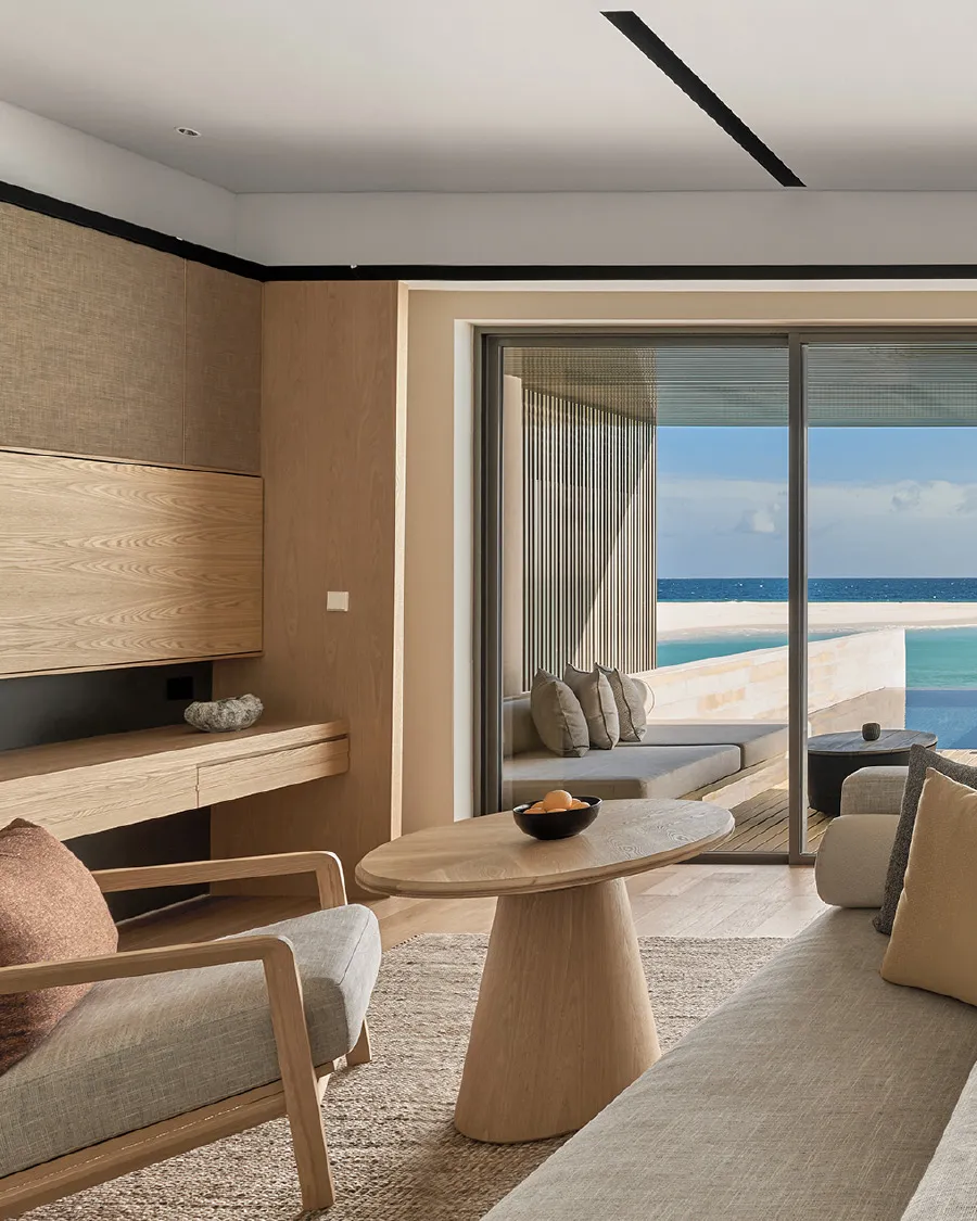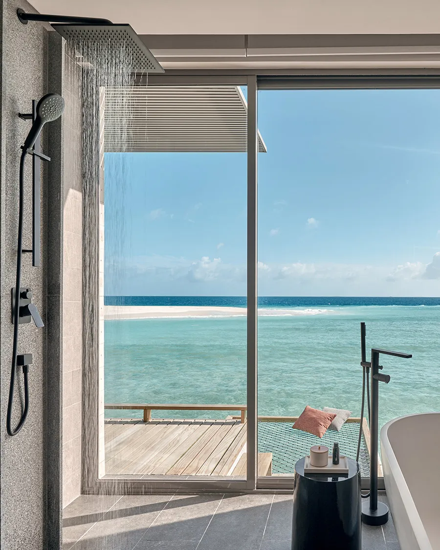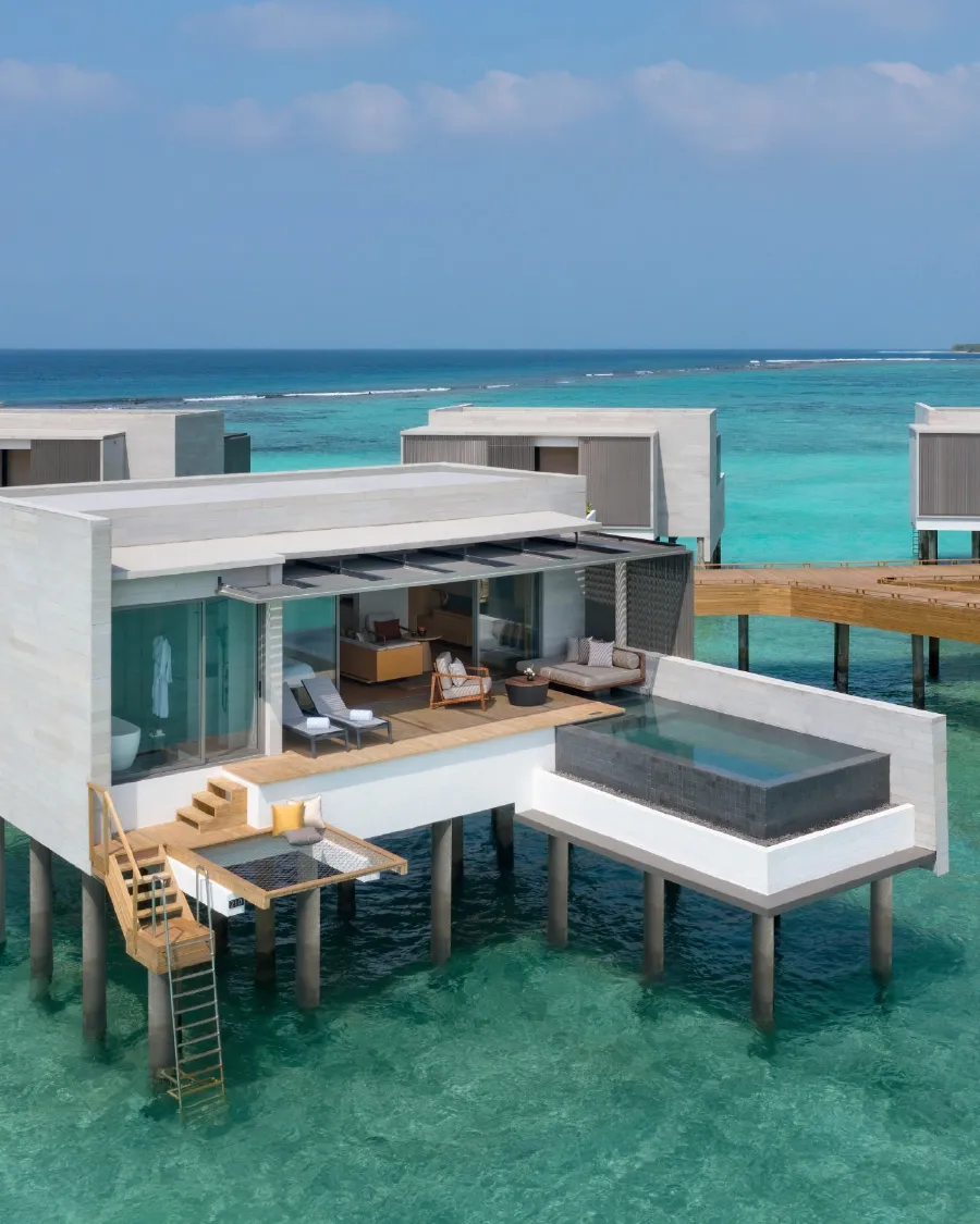 Each villa is designed with minimalist elegance, featuring a private pool and sun deck offering serene views and direct access to the beach or lagoon. The spacious interiors include open-concept bedroom and living areas with floor-to-ceiling glass doors. Beach Villas have separate bedroom and living room areas and open-air bathrooms in a garden court setting. Overwater Villas are arranged in a spiral for unobstructed ocean views, with options for sunrise or sunset vistas.