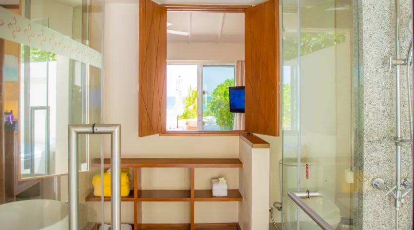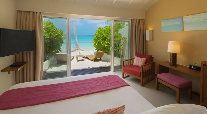 Experience the best of beachside living in this tranquil villa offering direct access to pure white sand and superb views across the lagoon. It includes a plush king-size bed, a bathroom that opens to an outdoor spa bathtub, and a sun lounging area.