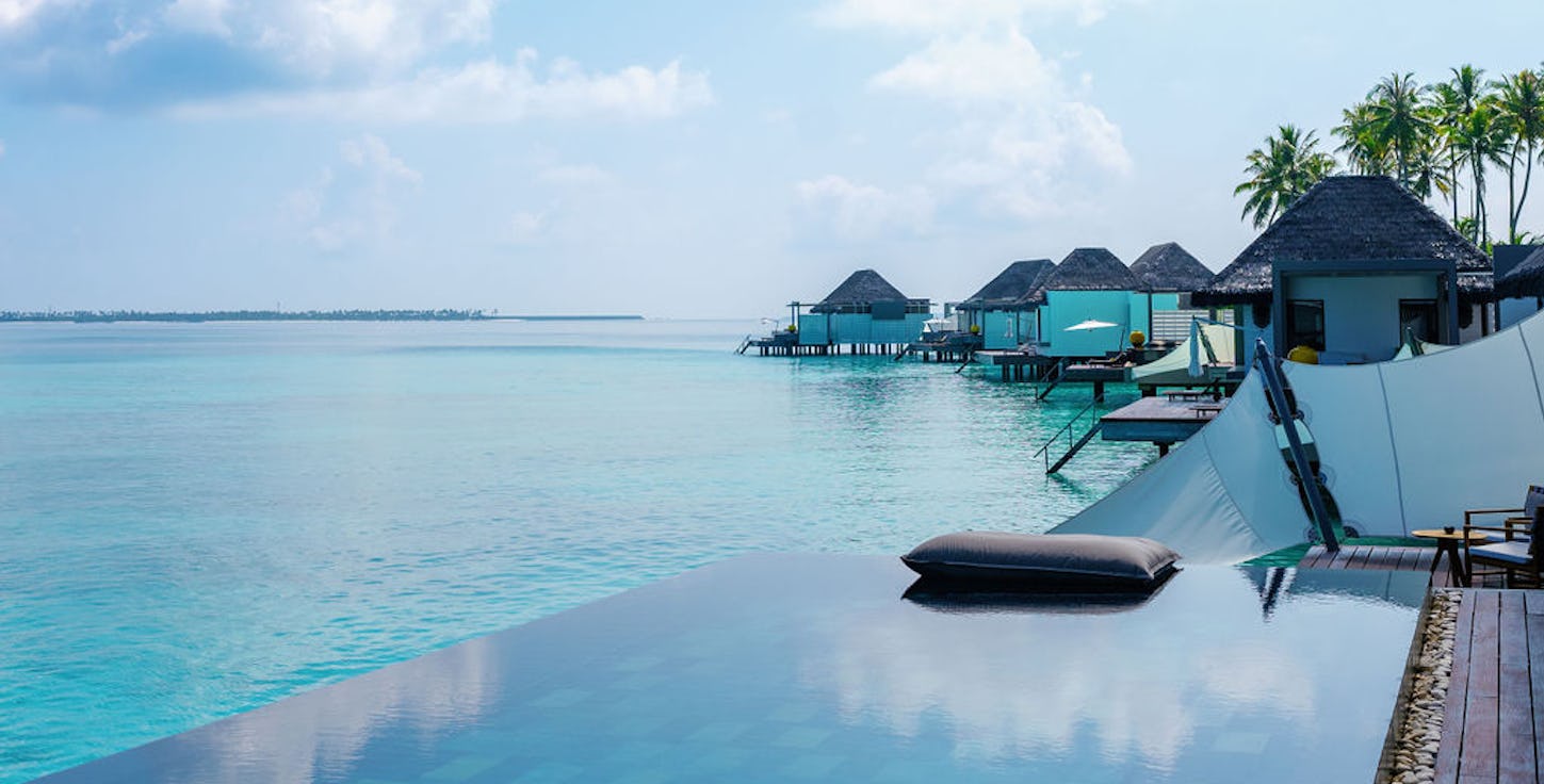 Overwater villa with direct lagoon access and a private pool.