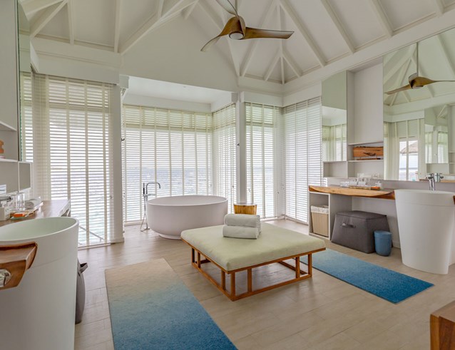 Designed for couples seeking an intimate and luxurious overwater experience, this villa features a king-size bed, private infinity pool, sun deck with loungers, direct lagoon access, a glass floor section for marine life viewing, and a spacious bathroom with standalone bathtub and rain shower.