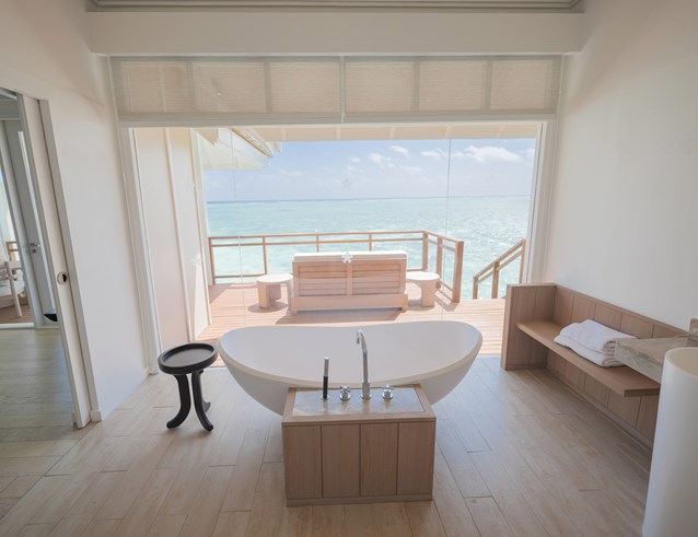Designed for couples seeking an intimate and luxurious overwater experience, this villa features a king-size bed, private infinity pool, sun deck with loungers, direct lagoon access, a glass floor section for marine life viewing, and a spacious bathroom with standalone bathtub and rain shower.