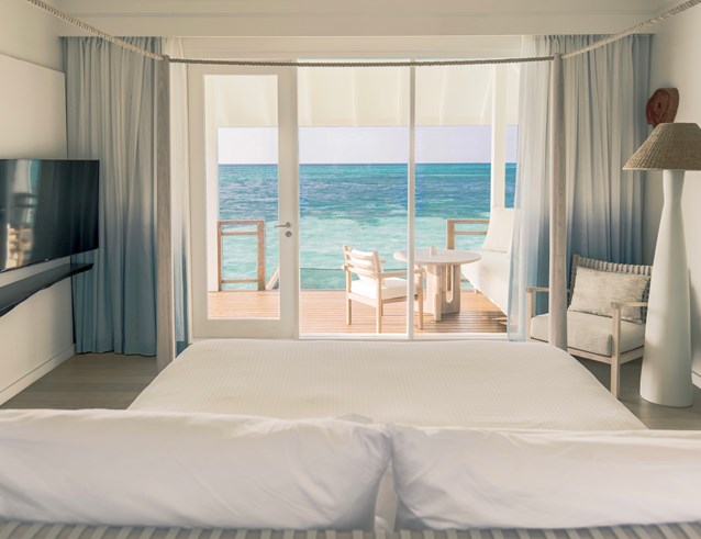 Idyllic overwater retreat with light and airy interiors, private sun terrace, catamaran net over the lagoon, glass floor window, outdoor deck with sunbeds, and direct ocean access. Located on the sunset side with breathtaking ocean views.