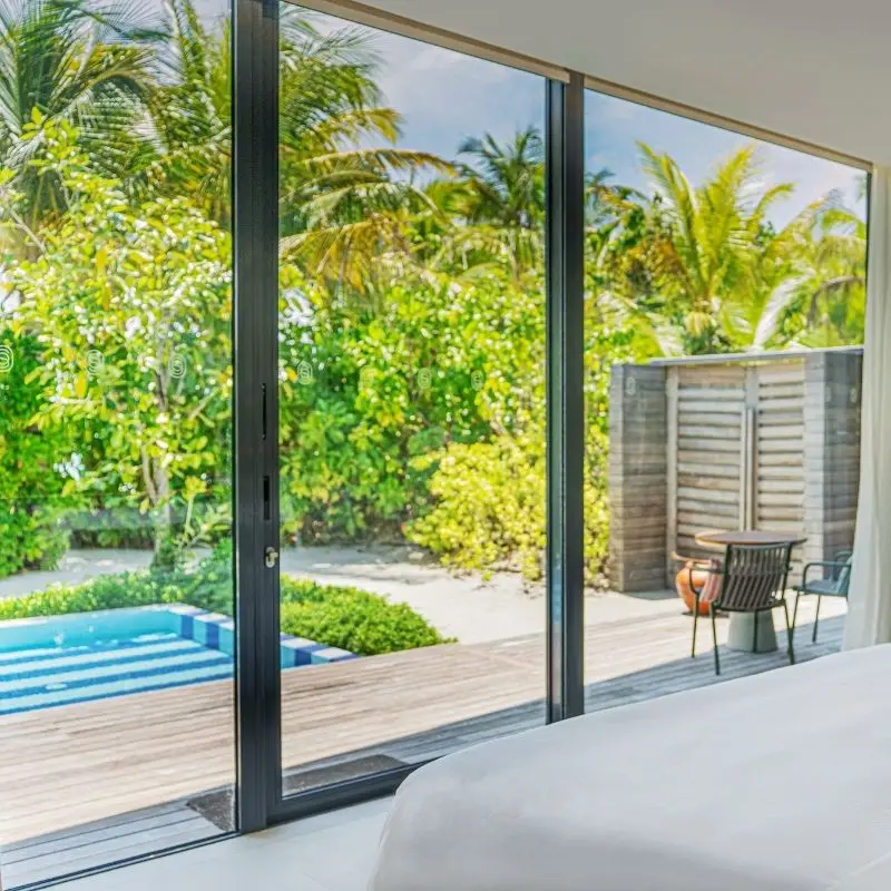 A luxurious two-level beachfront villa featuring two bedrooms, an infinity private pool, ocean views, and direct access to white Maldivian sands and turquoise lagoon. Includes modern amenities such as in-room bathtub with a view, indoor and outdoor rain showers, 55” Smart TV, Wi-Fi, minibar, Nespresso coffee machine, and energy-optimized air-conditioning and lighting system.