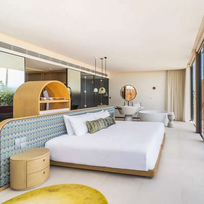 Each villa is designed for open-plan living with panoramic ocean views, featuring private pools and decks. The accommodations blend modern luxury with artistic flair, offering a stylish and comfortable retreat.