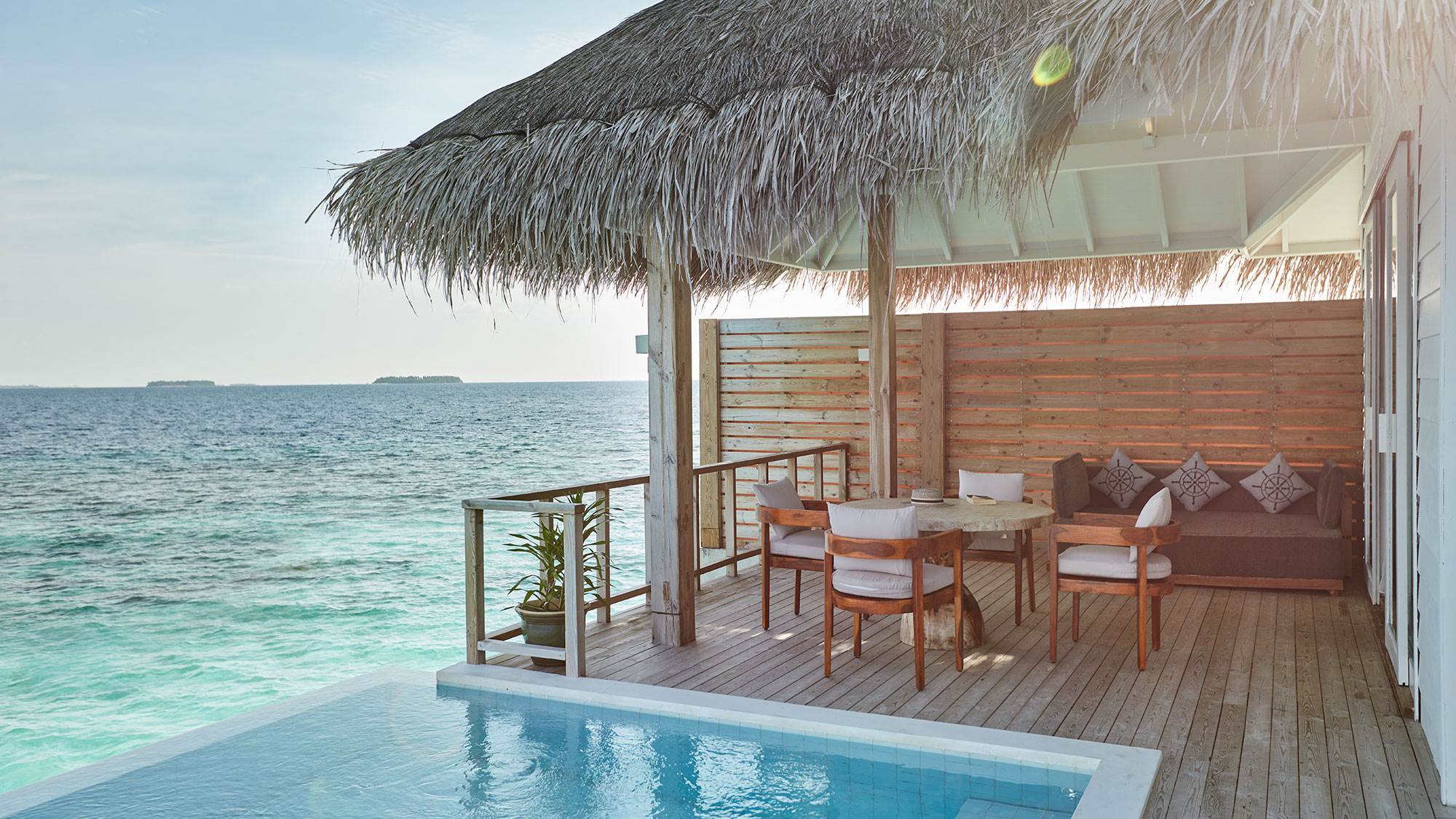 Luxurious overwater residence featuring an expansive sundeck and veranda, private infinity pool, and uninterrupted lagoon and Indian Ocean views. Perfect for couples and families seeking spacious and elegant accommodation with separate lounging and dining areas.