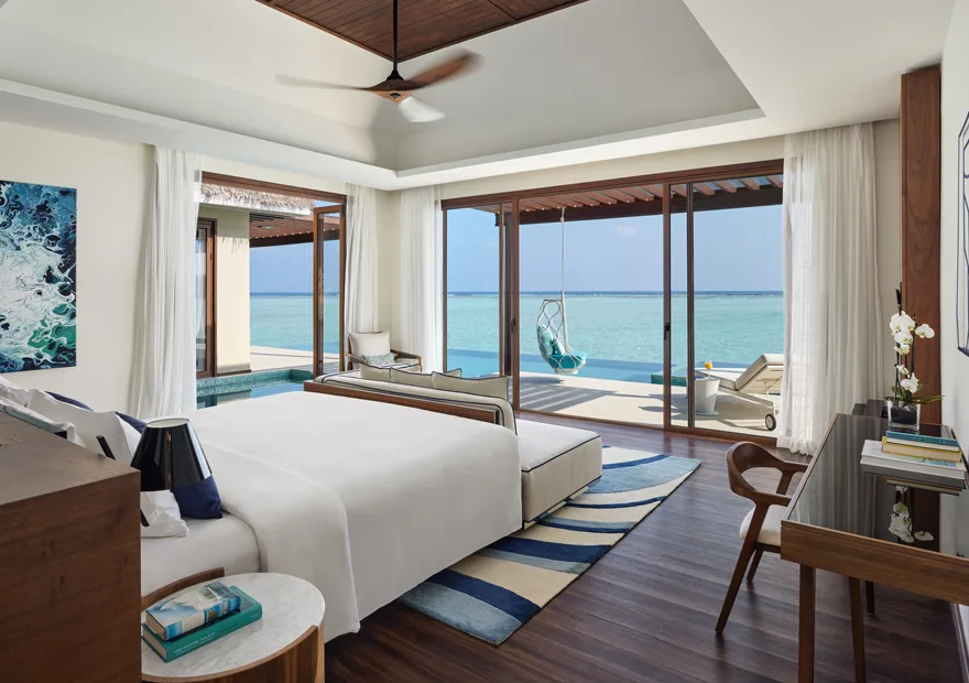 Experience luxury in this expansive 190 sqm overwater villa featuring a king-size bed, private infinity plunge pool, direct lagoon access, superior ocean views, Jacuzzi at the water's edge, Thakuru butler service, complimentary WiFi, Nespresso machine, and popcorn machine.