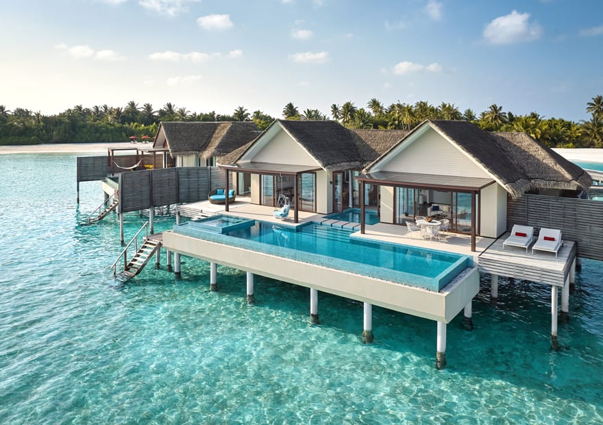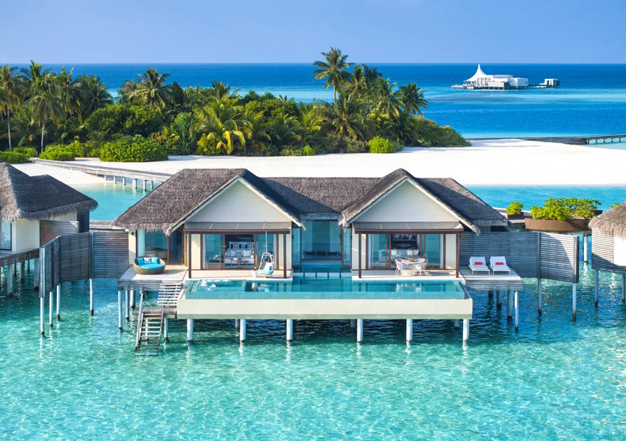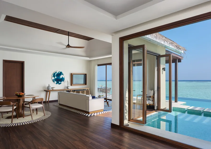 The Two Bedroom Ocean Pool Pavilion offers an expansive and luxurious overwater experience with two ensuite bedrooms, a private infinity pool with jacuzzi, direct lagoon access, and uninterrupted sunrise views over the Indian Ocean. Ideal for families or groups seeking privacy and comfort with amenities including a sunken living room, dining area, wet bar, pantry, Nespresso machine, popcorn machine, and complimentary Wi-Fi.