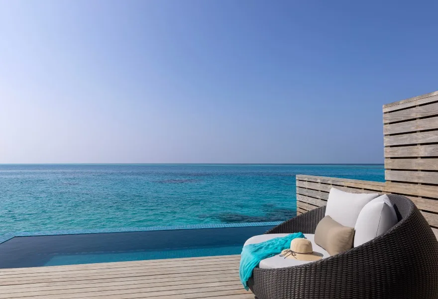 The Three Bedroom Sunset Over Water Pool Residence offers an expansive 368 sqm of luxurious space surrounded on three sides by panoramic ocean views. Featuring two king-size beds and two twin beds, this villa includes a private pool, direct lagoon access, and premium AvaniSpa amenities for an unparalleled experience.