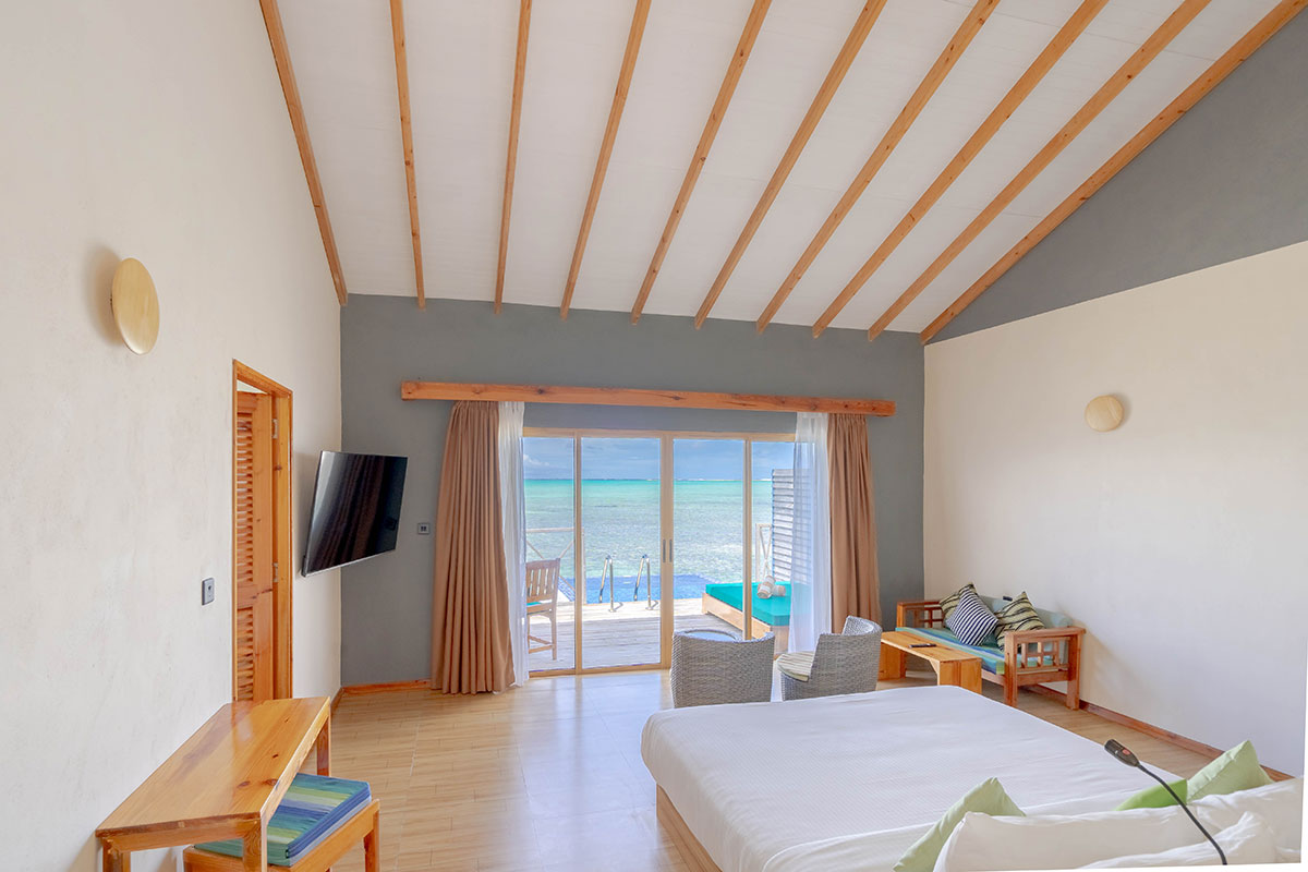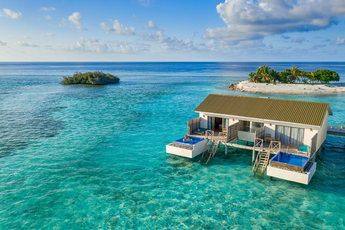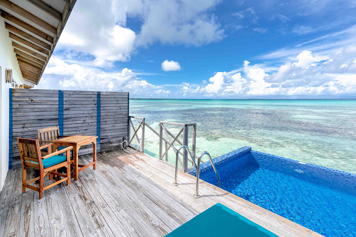 These villas are set on stilts over the lagoon, providing a unique island experience.