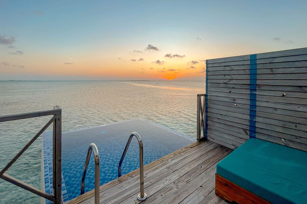 An overwater villa with panoramic lagoon views, a private infinity pool, and direct access to the lagoon, ideal for honeymooners.