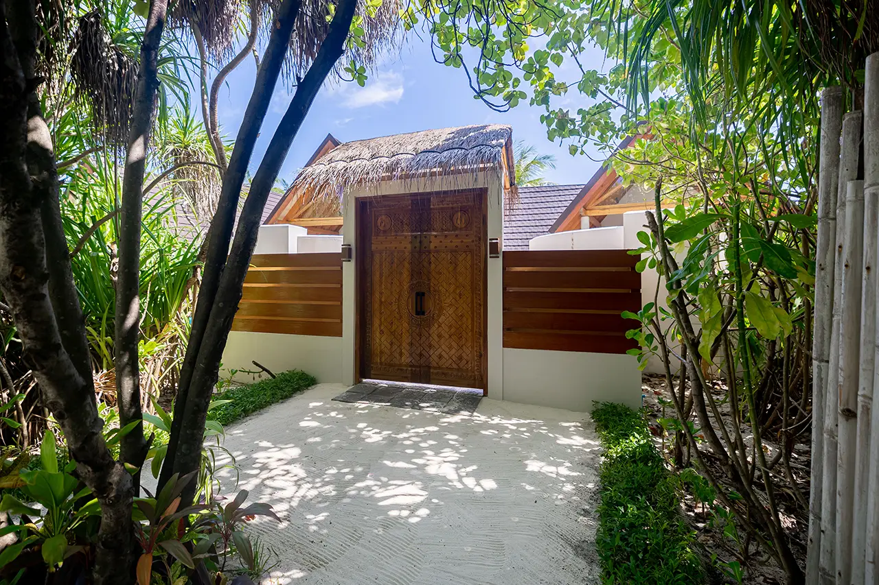 Luxurious villa on the western side of the island with stunning sunset views over the Etherevari lagoon. Features contemporary Maldivian design, a spacious bedroom with king-sized bed, study table, and an outdoor bathroom with double vanity, rain shower, and bathtub.