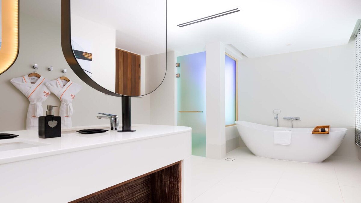 Experience luxury in this one-bedroom overwater villa featuring a private plunge pool, infinite ocean views, a terrace with sun beds and lounging net, sofa bed for an extra guest, and premium amenities including a 55" Smart TV, Sound of Your Stay® program, and Rock Royalty® benefits.