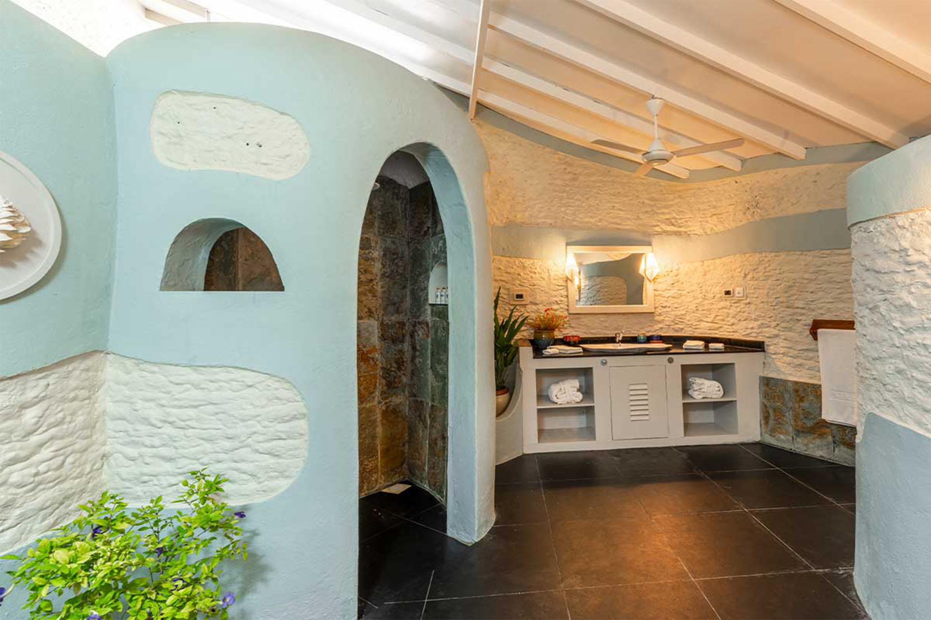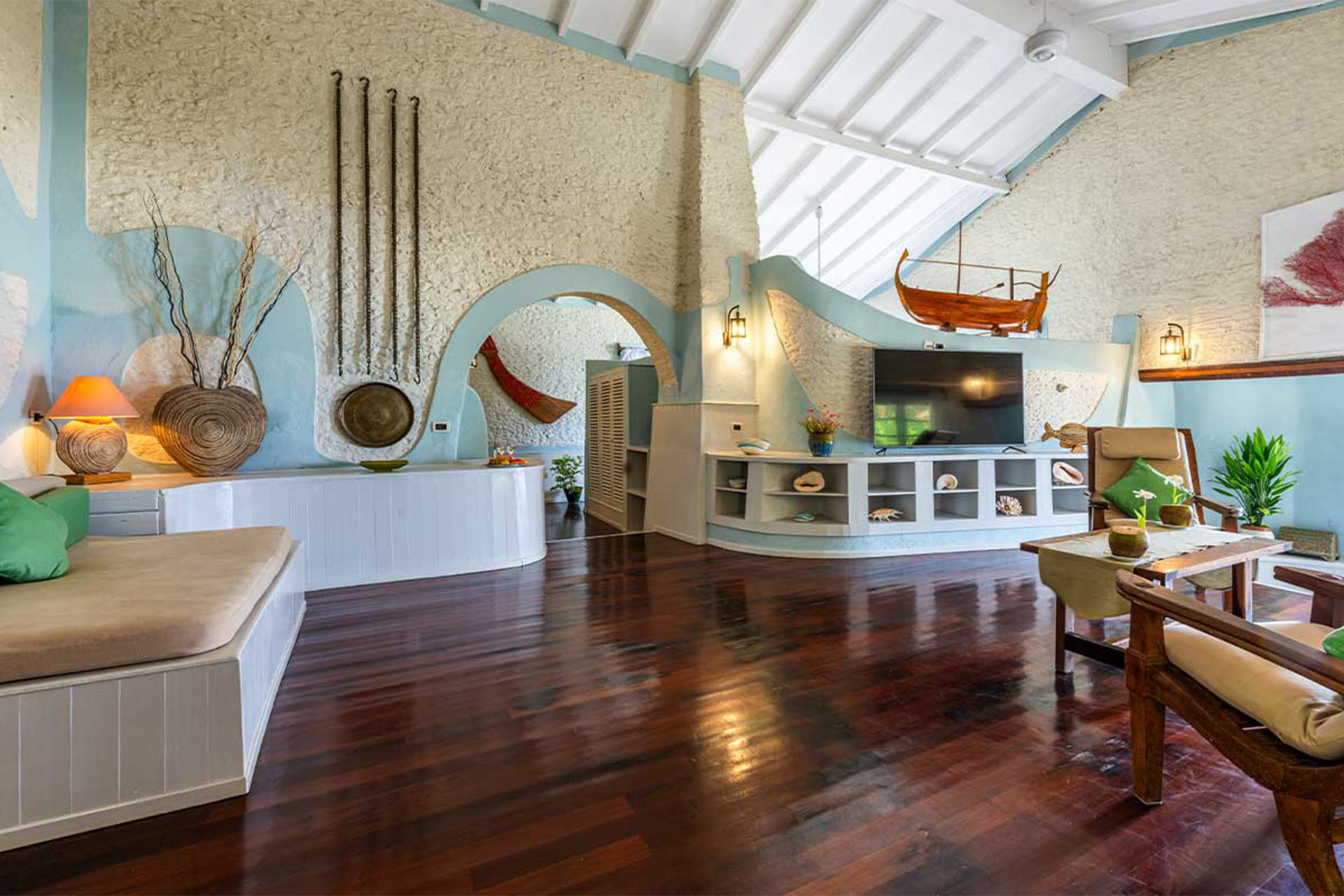 Designed for families, this villa has two bedrooms and a large living area opening to the beach.