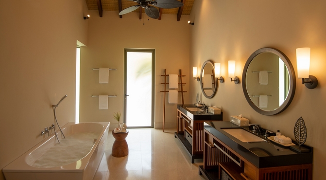 Luxurious beachfront villa featuring a lagoon-facing bedroom and bathroom opening onto a spacious verandah with sun loungers. Enjoy panoramic ocean views from a private pool, an oversized bathtub, and both indoor and outdoor showers for an indulgent bathing experience.