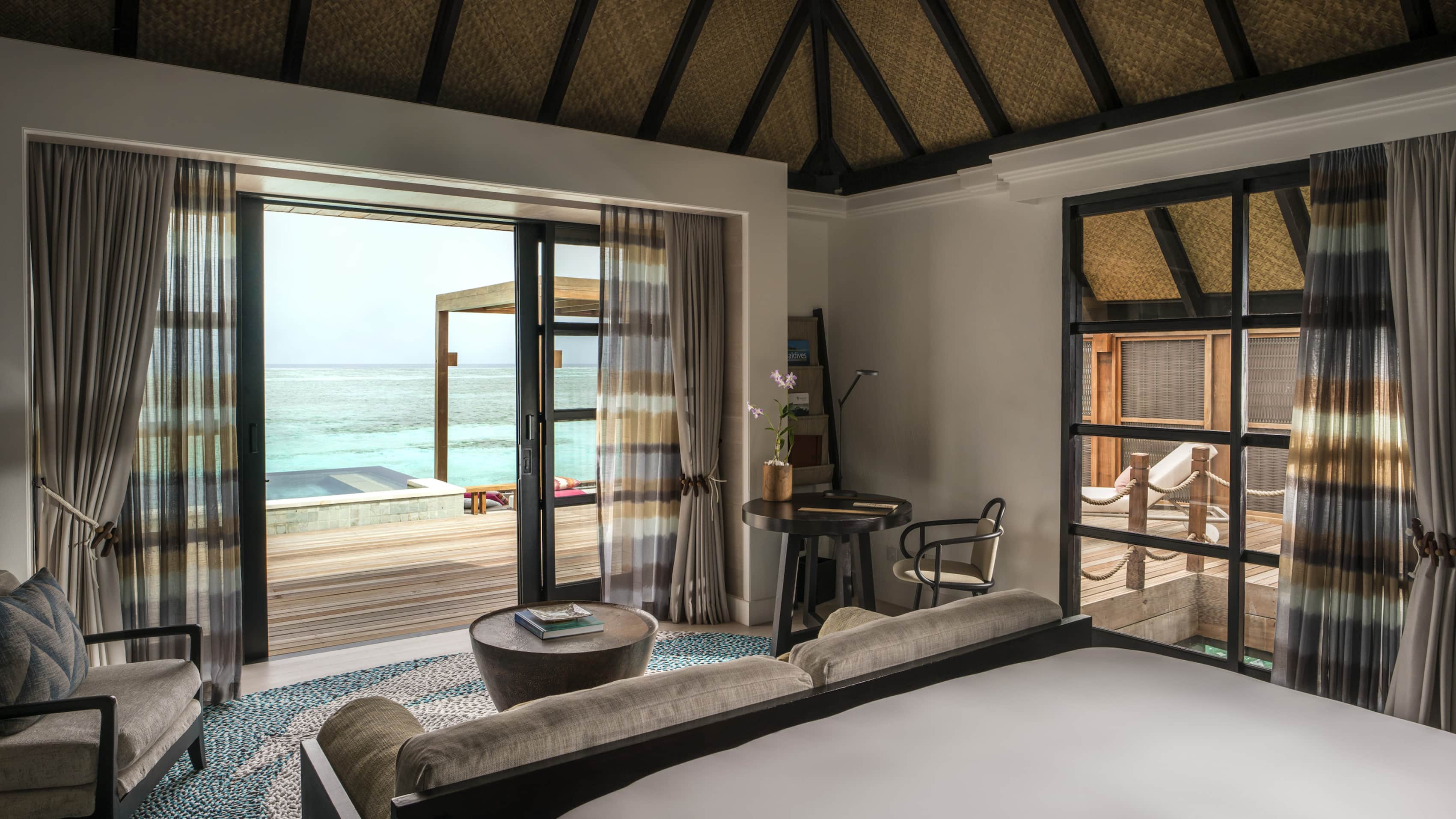 The Sunset Three-Bedroom Water Suite offers an unparalleled over-water living experience with spacious interiors and expansive outdoor areas, featuring three bedrooms, three full bathrooms, a guest powder room, an outdoor shower, and a private infinity pool with panoramic ocean, lagoon, and sunset views. It accommodates up to 6 adults and 2 children, blending indoor elegance with outdoor serenity in the Maldives.