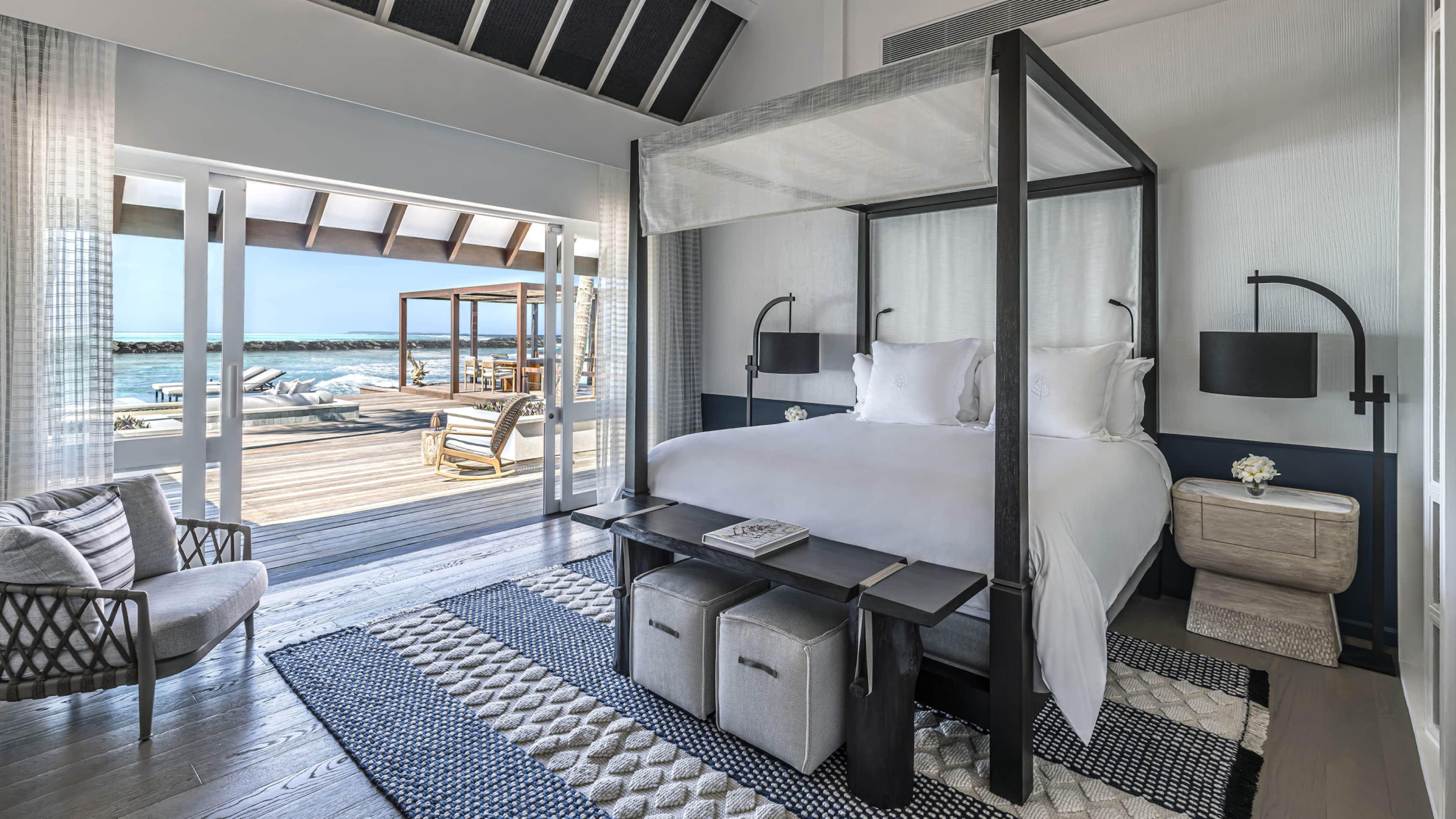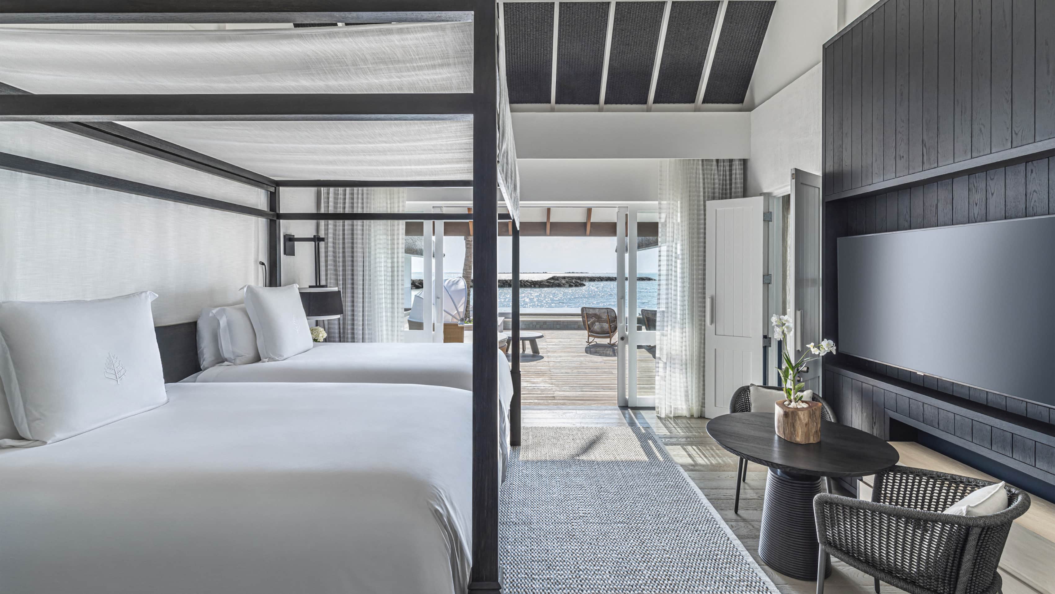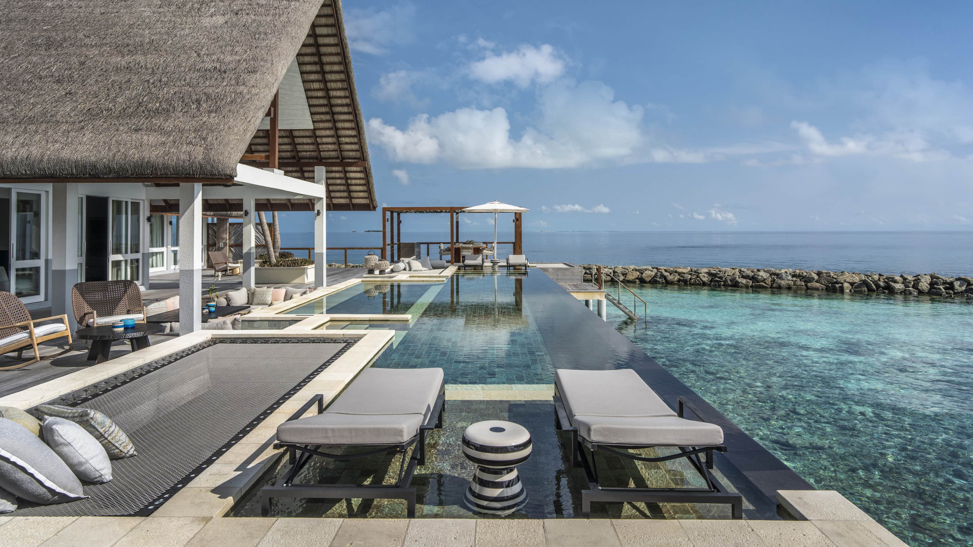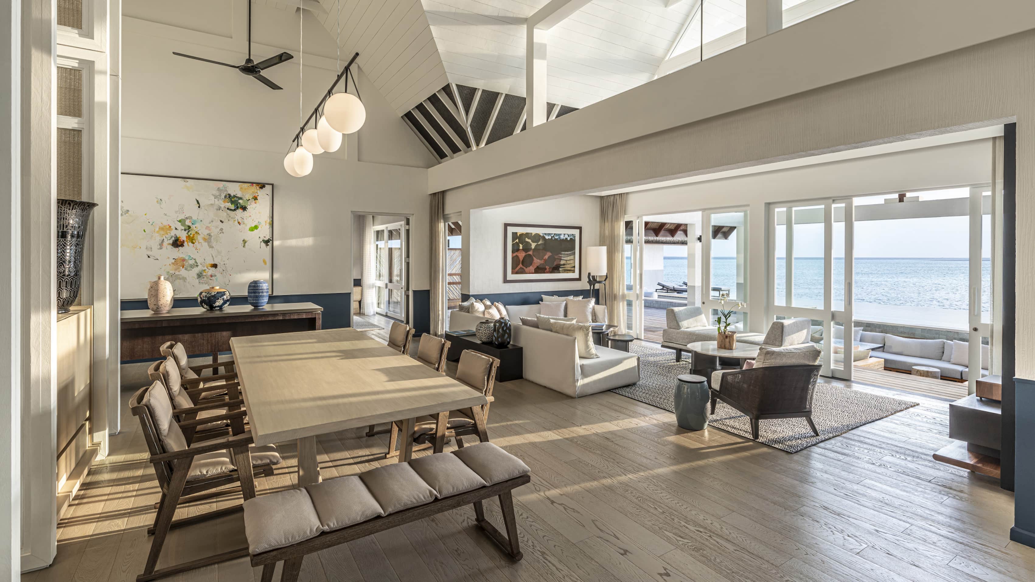 Luxurious overwater suite featuring three bedrooms with en-suite bathrooms, a private 20-meter infinity pool, stunning sunset ocean views, direct lagoon access, spacious living and dining areas, a fully equipped kitchenette, private study, glass floor panel, overwater hammock, and private gym. Accessible only by boat for exclusive privacy.