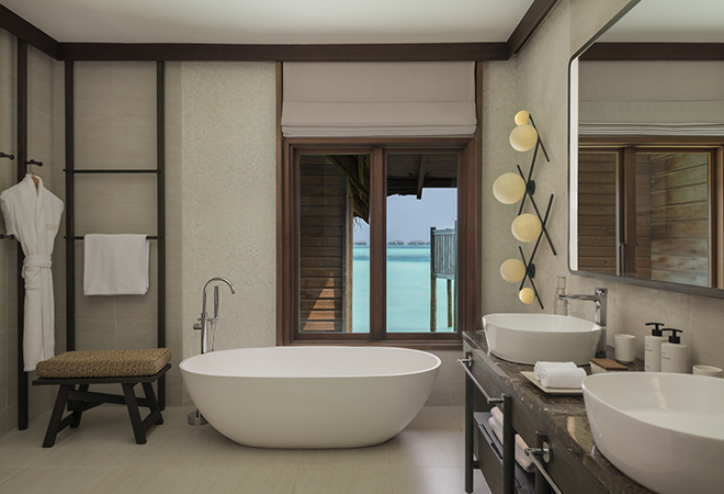 Luxurious overwater villa perched above the turquoise ocean with direct sea access from the sundeck, private whirlpool, spacious living area, and a sunlit bathtub in the bathroom.