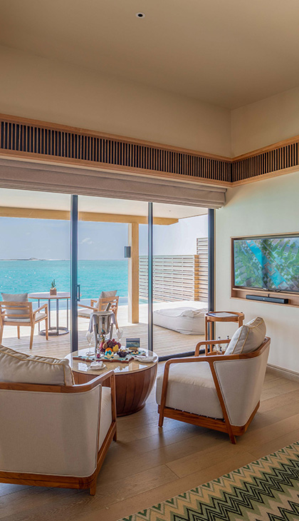 An expansive and luxurious three-bedroom beachfront residence featuring spacious living areas, a private pool overlooking the lagoon, panoramic ocean views, and exclusive amenities including a private terrace, dedicated workspace, wine cellar, and butler service.