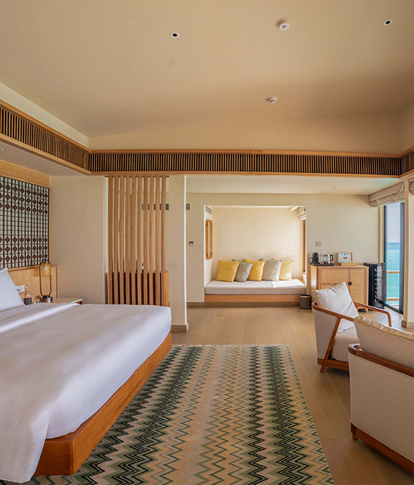 Experience luxury in this spacious overwater villa featuring a king-size bed, private infinity pool, indoor bathroom with rain shower and bathtub, and a private deck with direct lagoon access and sunrise ocean views.