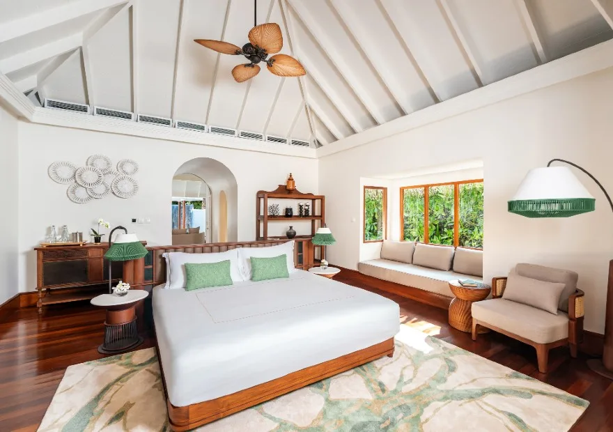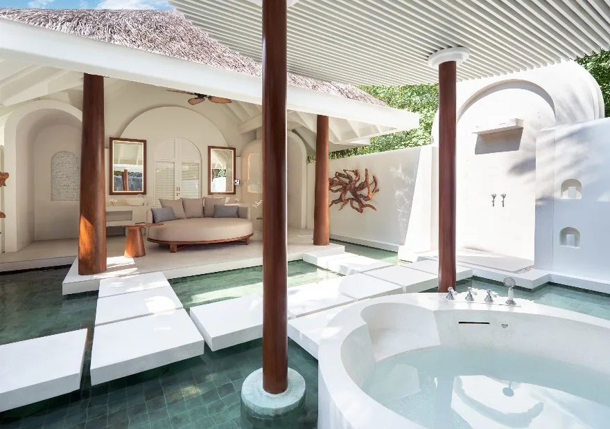 An expansive and luxurious two-bedroom residence over the Indian Ocean featuring panoramic sunset views, a private infinity-edge pool, spacious indoor and outdoor living areas, al fresco bathrooms with marine life views, a private spa treatment room, and a fitness area. Ideal for families or groups seeking privacy and exclusivity.