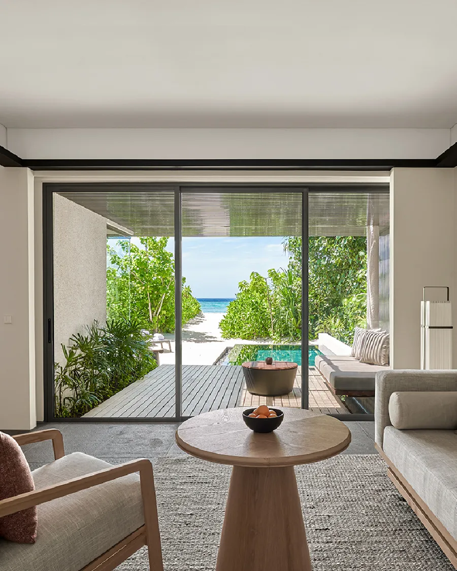 Each villa is designed with minimalist elegance, featuring a private pool and sun deck offering serene views and direct access to the beach or lagoon. The spacious interiors include open-concept bedroom and living areas with floor-to-ceiling glass doors. Beach Villas have separate bedroom and living room areas and open-air bathrooms in a garden court setting. Overwater Villas are arranged in a spiral for unobstructed ocean views, with options for sunrise or sunset vistas.