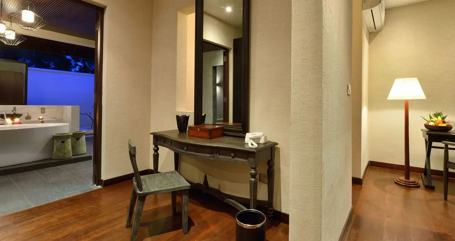 Each villa is designed with Maldivian interiors, featuring open-air bathrooms and private outdoor garden areas with sun loungers. The overwater villas offer direct access to the lagoon, with some featuring private pools and glass floor panels for underwater viewing. All accommodations provide modern amenities, including iPod docks, coffee machines, and spacious living areas.