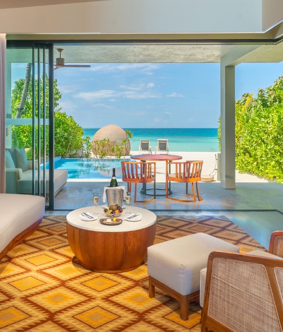 An expansive and luxurious three-bedroom beachfront residence featuring spacious living areas, a private pool overlooking the lagoon, panoramic ocean views, and exclusive amenities including a private terrace, dedicated workspace, wine cellar, and butler service.