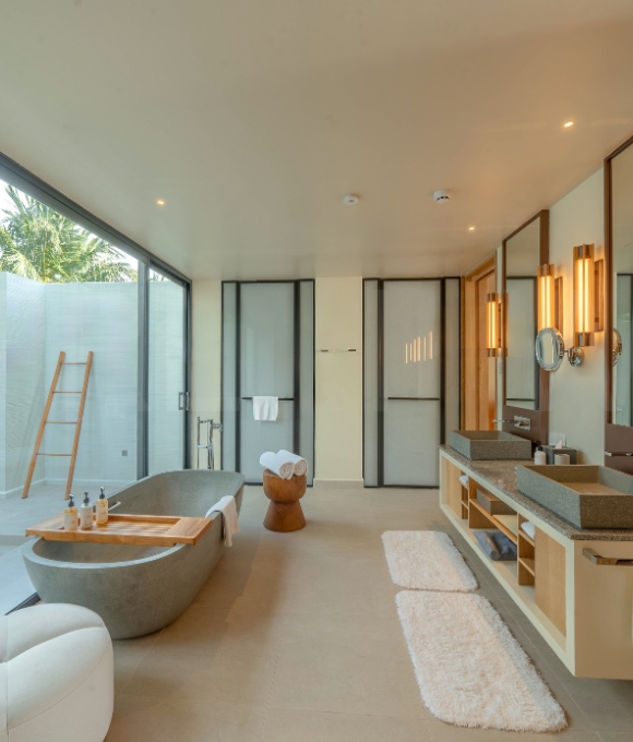 A luxurious beachfront villa featuring a king-sized bed, private pool, indoor bathroom with rain shower and bathtub for two, private patio with sunbeds, dedicated workspace, complimentary Wi-Fi, butler service, minibar, espresso machine, mood lighting, bathrobes, toiletries, turndown services, and safe deposit box. Enjoy spectacular ocean-facing sunset views in a secluded, serene environment.