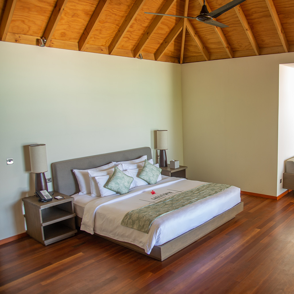Perched above the lagoon with direct access to the house reef, this villa features a king-sized bed, a partially open-air bathroom with rain shower and open-air Jacuzzi, a private deck with sunrise views, and luxurious amenities including a 55-inch TV, minibar, and complimentary Wi-Fi.