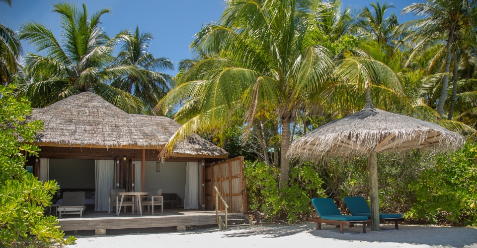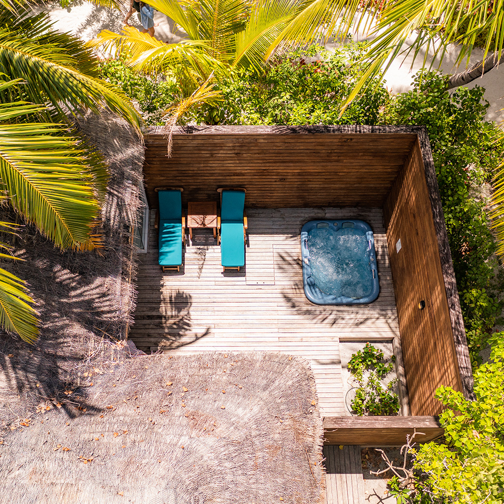 The Jacuzzi Beach Villas at Veligandu Maldives offer a luxurious and intimate retreat with a spacious 86 sqm villa featuring a king-sized bed, partially open-air bathroom, private outdoor Jacuzzi on the veranda, and direct beach access with lush tropical garden and ocean views.