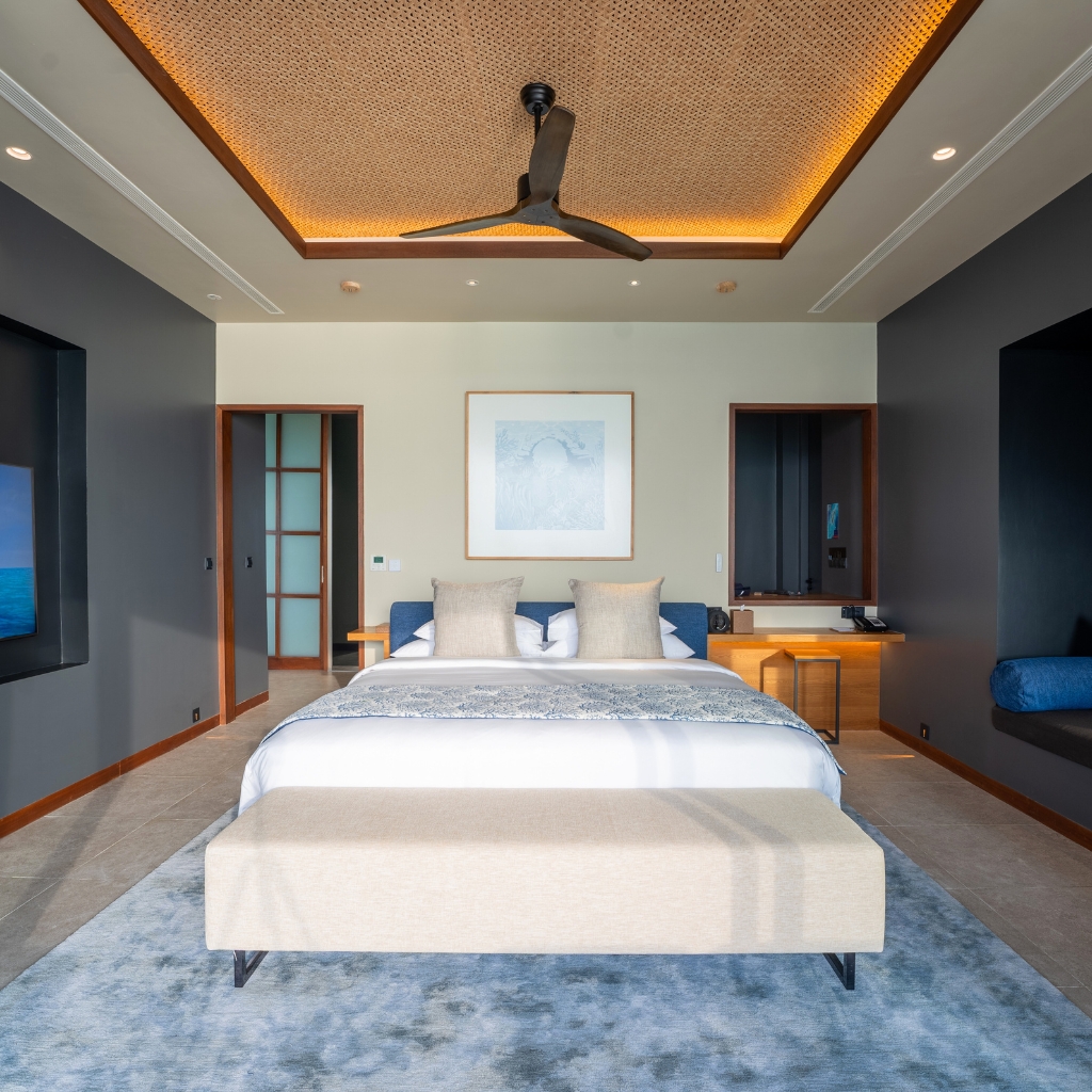 Perched above the lagoon with direct access to the house reef, this villa features a king-sized bed, a partially open-air bathroom with rain shower and open-air Jacuzzi, a private deck with sunrise views, and luxurious amenities including a 55-inch TV, minibar, and complimentary Wi-Fi.