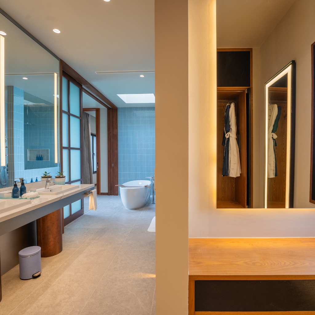 Experience unparalleled luxury in this overwater villa featuring a king-sized bed, private 6.5 x 3 meter plunge pool, floor-to-ceiling glass doors with stunning sea views, a standalone bathtub with ocean view, and direct access to the vibrant house reef via a wide staircase. Enjoy spacious decks with loungers, a glass floor viewing panel, and premium amenities including a 65-inch smart TV, minibar, and complimentary Wi-Fi.