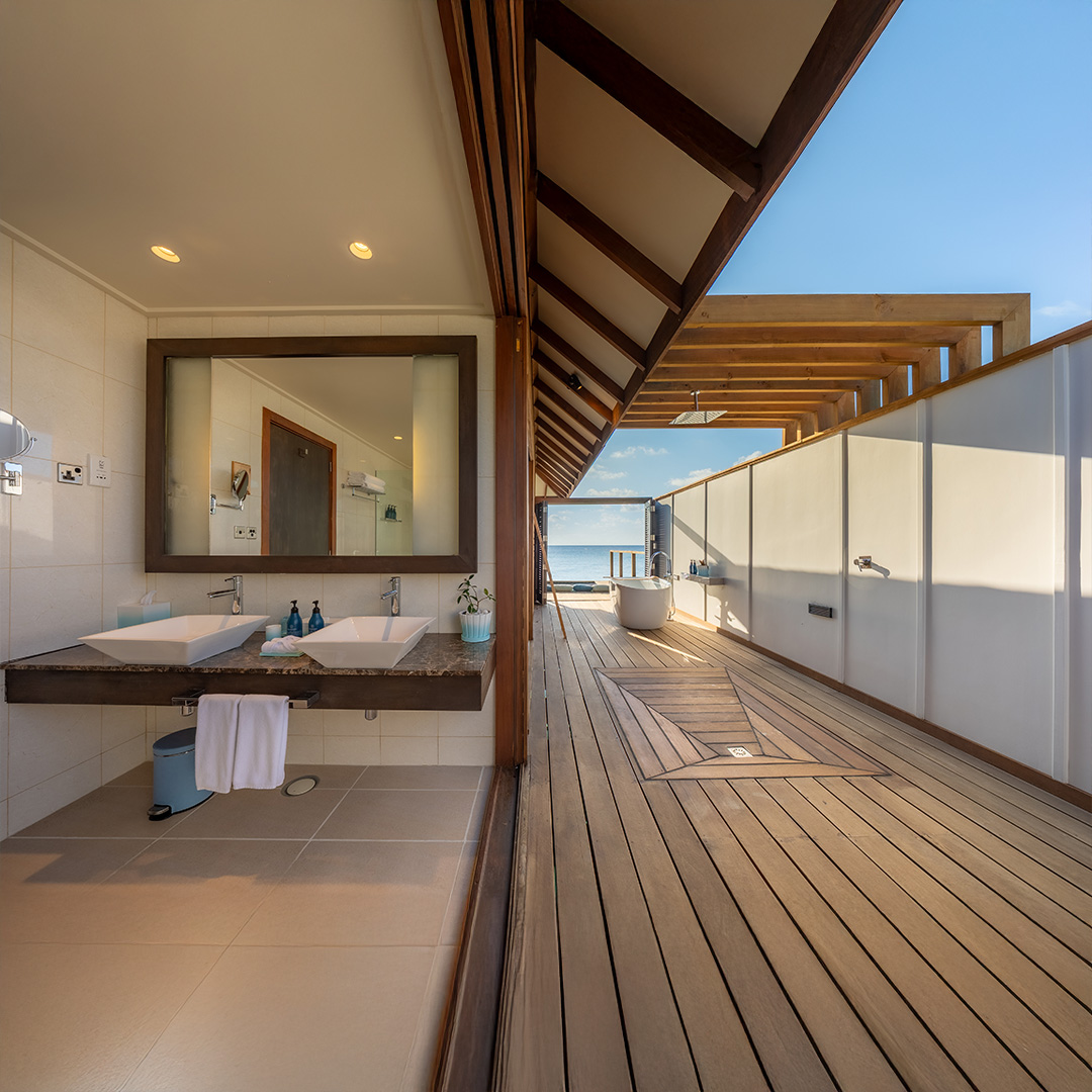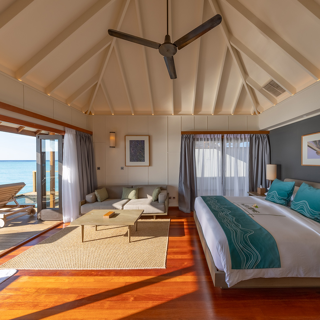 Perched above the lagoon with direct access to the house reef, this villa features a king-sized bed, a partially open-air bathroom with rain shower and open-air Jacuzzi, a private deck with sunrise views, and luxurious amenities including a 55-inch TV, minibar, and complimentary Wi-Fi.