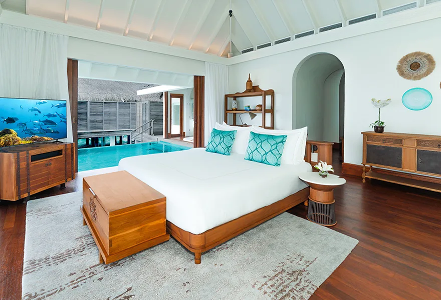 An expansive and luxurious two-bedroom residence over the Indian Ocean featuring panoramic sunset views, a private infinity-edge pool, spacious indoor and outdoor living areas, al fresco bathrooms with marine life views, a private spa treatment room, and a fitness area. Ideal for families or groups seeking privacy and exclusivity.