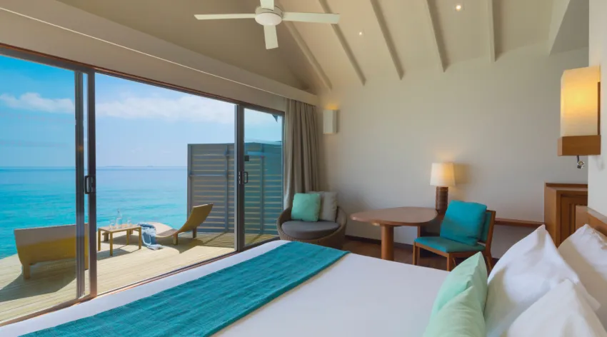 An intimate overwater villa offering spectacular Maldivian sunset views, direct lagoon access, and modern amenities including air conditioning, free WiFi, and a furnished deck.