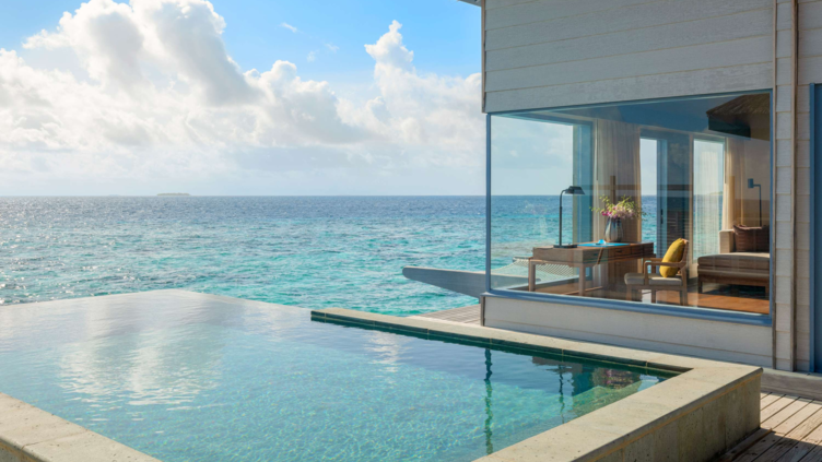 Experience unparalleled comfort and privacy in this two-bedroom overwater residence featuring a private pool and breathtaking west-facing views of the Maldivian sunset over the Indian Ocean.