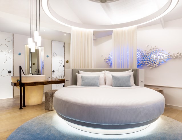 Exclusive overwater villa designed for couples featuring a 12-meter private infinity pool, direct lagoon access, a round bed, separate living room, outdoor deck with sunbeds and bird's nest swing, and luxurious amenities including Jacuzzi, air conditioning, minibar, and Wi-Fi.
