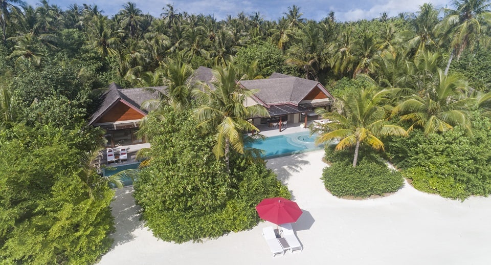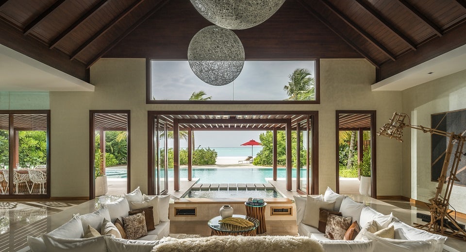 A luxurious and spacious villa designed for families, featuring a master bedroom with a king-size bed, a living area with a sofa bed for children, a private plunge pool, direct beach access, and ocean views. Includes amenities like a popcorn machine, Nespresso machine, complimentary Wi-Fi, and a private deck with a dhoni swing.