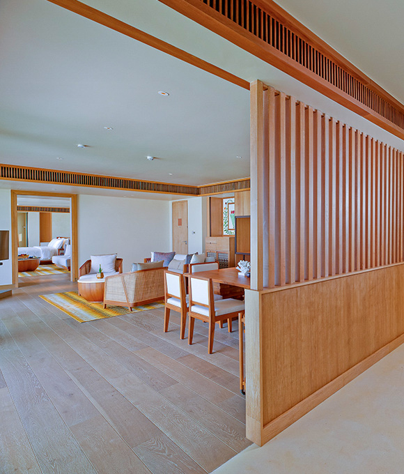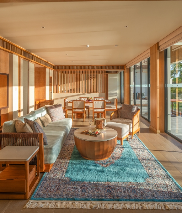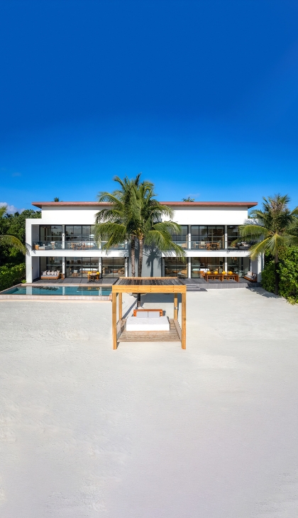An expansive and luxurious three-bedroom beachfront residence featuring spacious living areas, a private pool overlooking the lagoon, panoramic ocean views, and exclusive amenities including a private terrace, dedicated workspace, wine cellar, and butler service.