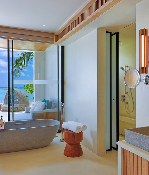 Surrounded by lush vegetation, this beachfront retreat offers sea views from your king-size bed, a private pool, and a luxurious bathtub for two.